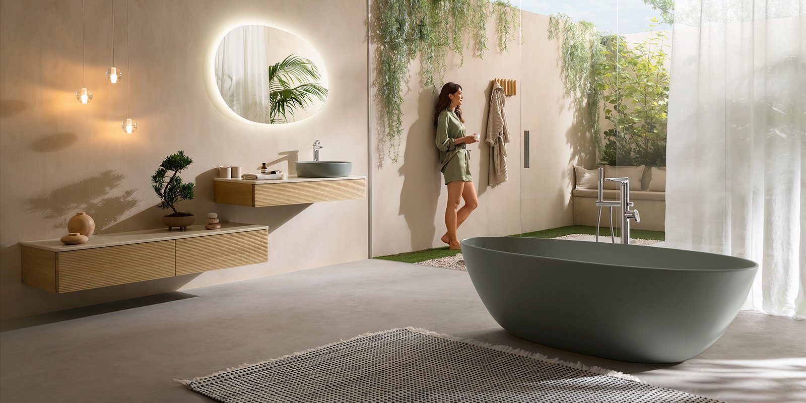 Antao von Villeroy & Boch: Naturinspirierte Badkollektion mit organischen Formen. Entdecken Sie tautropfenförmige Waschtische, freistehende Quaryl-Badewannen und harmonische Möbel in erdigen Farbtönen. Designt von kaschkasch für Ihr Wohlfühlbad.