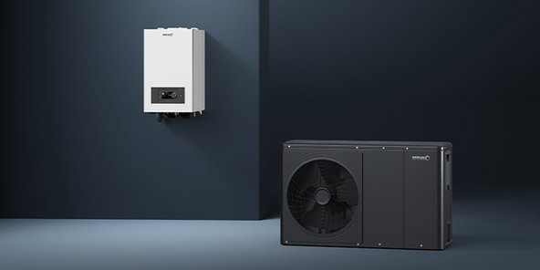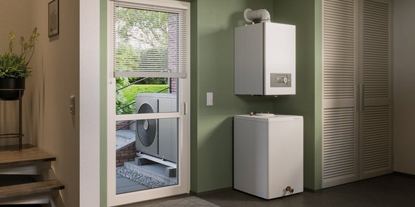 Damit ist der neue und bereits effizientere Gaskessel mit nur 30 zusätzlichen Minuten für die Installation und mit überschaubaren Mehrkosten hybridfähig. Ab dem Einbau des Kit 65 bleiben dann bis zu fünf Jahre Zeit, den regenerativen Anteil von 65 % – in dem Fall die Wärmepumpen-Außeneinheit – nachzurüsten. Mit der Installation der Wärmepumpen-Außeneinheit nimmt das Kit 65 die Rolle der Inneneinheit ein und sorgt dafür, dass ein Pufferspeicher nicht mehr notwendig ist. Die Regelung und Hydraulik sind im Kit 65 und im Gaskessel verbaut. Die Steuerung beider Wärmeerzeuger erfolgt über das bedienerfreundliche Display am Kessel.