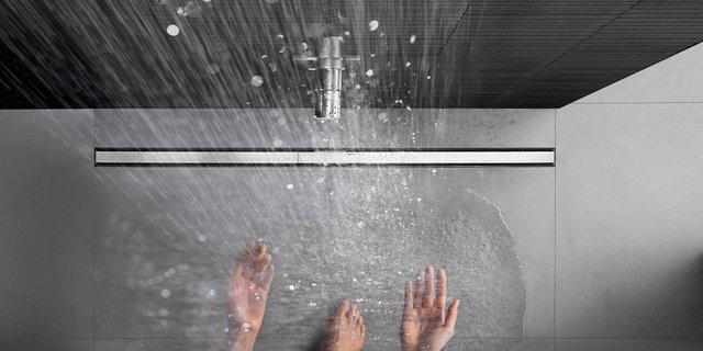 Die Geberit Duschrinne CleanLine50 verfügt über ein integriertes Gefälle für eine schnelle Wasserableitung.