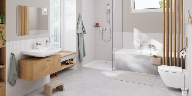 In klassischem Chrom passt GROHE Cubeo zur weichen, hellen Trendfarbe Coconut Milk. Die Kombination wirkt einladend und beruhigend; Natureiche, Pflanzen und salbeifarbene Accessoires machen das Bad zu einem gemütlichen Rückzugsort.