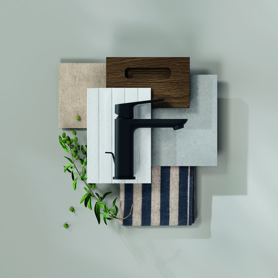 GROHE Cubeo im modernen und zugleich zeitlosen Matt Black – eine gegen Korrosion, Verblassen und Kratzer beständige Pulverbeschichtung – harmoniert mit der bräunlichen Nuance Rubber, dunkleren Hölzern wie Walnuss oder braun getönter Eiche und hellen Fliesen. Zum raffinierten, kontrastreichen Ambiente passen Accessoires aus Naturfasern oder mit auffälligen Mustern.